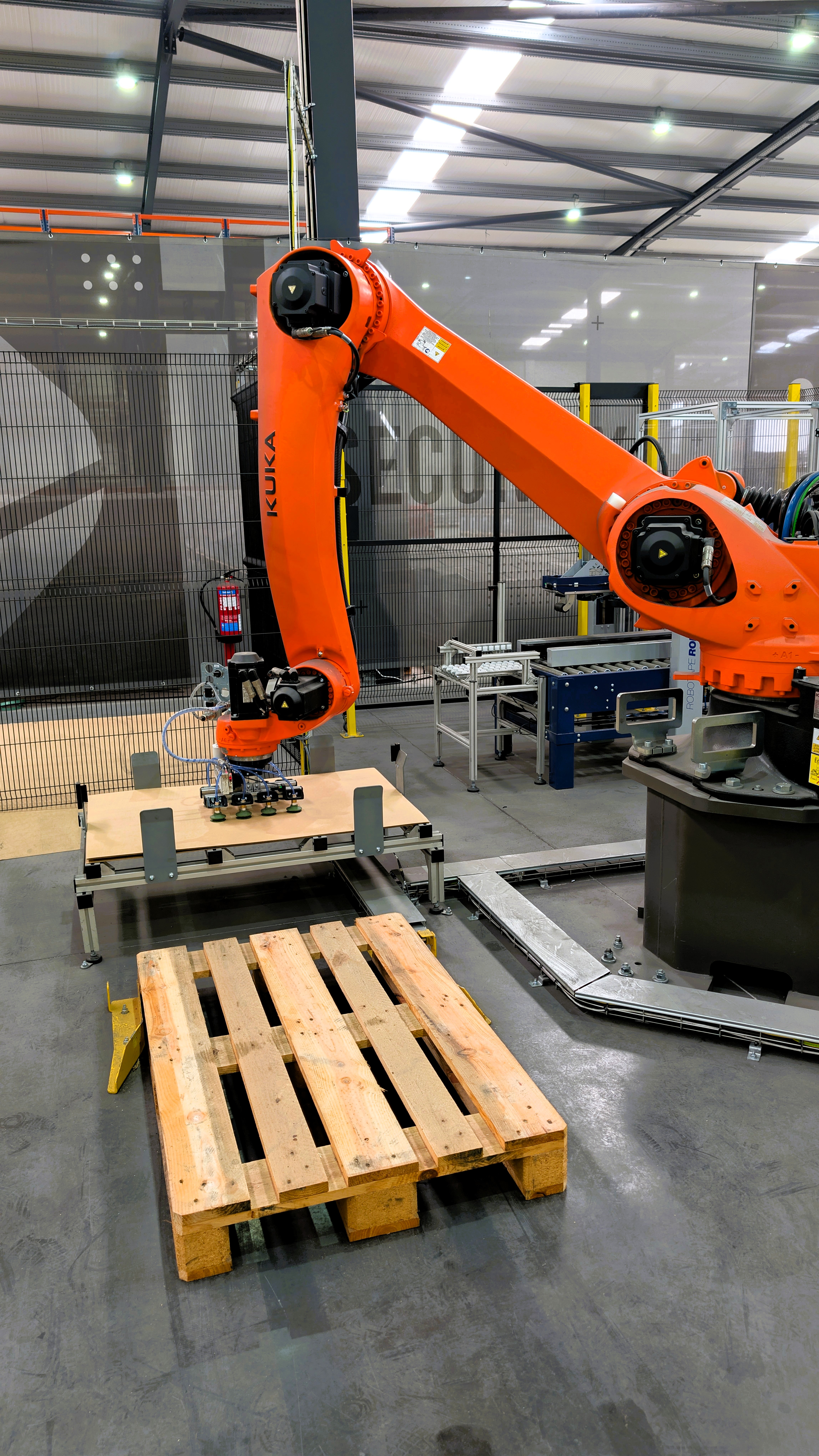 No núcleo da operação, o braço robótico KUKA KR 140 garante uma manipulação de carga precisa e veloz, potenciada por um sistema de entrada dupla para paletes, esta configuração estratégica permite que a linha nunca pare: enquanto uma palete é completada, a segunda já se encontra em posição de espera, eliminando tempos mortos.